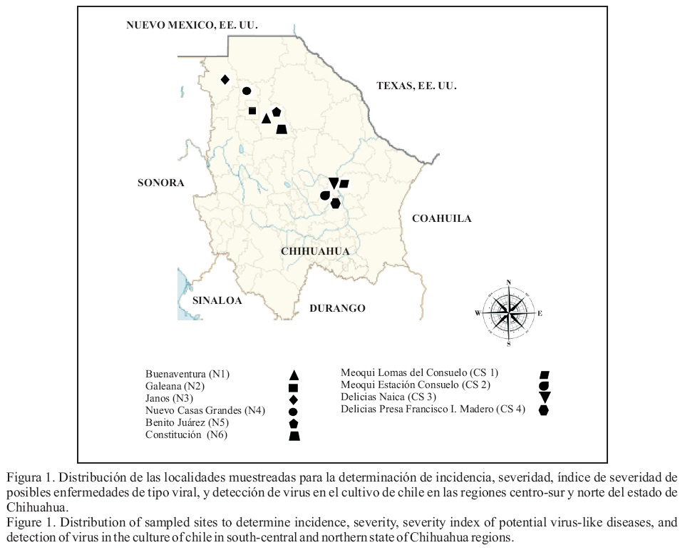 Determinación de la incidencia y severidad. Se realizaron recorridos de campo en la etapa de desarrollo y fructificación del cultivo para determinar la incidencia y severidad en plantas de chile que presentaban síntomas característicos de una probable enfermedad de tipo viral en cuatro localidades de la región centro-sur y en seis localidades de la región norte del estado de Chihuahua (Figura 1). En cada localidad se seleccionaron tres predios para su evaluación. Para medir la incidencia se seleccionó el 10% del total de surcos distribuidos a lo largo y ancho de cada predio. Se hizo el conteo de plantas aparentemente sanas y plantas que presentaban síntomas característicos de enfermedades virales, tales como mosaicos, moteado, deformación de hojas, clorosis, ampollamiento y enanismo.