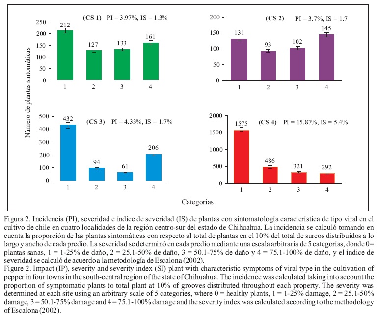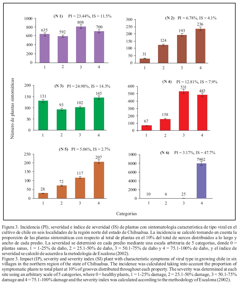 Incidencia y severidad de la virosis. La incidencia y severidad se determinó en plantas de chile que presentaban síntomas característicos de infecciones de tipo viral. En la región centro-sur, se observó una mayor incidencia e índice de severidad en la localidad CS4 con valores de 15.9% y 5.4%, respectivamente, siendo mayor la categoría 1 en la escala de severidad. Lo anterior muestra que aunque se tienen menor cantidad de plantas en la categoría 4, el avance de la enfermedad es muy importante, lo cual podría incrementar la diseminación de las enfermedades virales, causar la pérdida de plantas y reducir de manera importante la producción de chile. Por otro lado, las localidades CS1, CS2 y CS3 fueron similares en las variables de incidencia (3.9%, 3.7% y 4.3%, respectivamente) e índice de severidad (1.3%, 1.7% y 1.7%, respectivamente) (Figura 2). En la región norte, las localidades N1 y N3 presentaron la mayor incidencia de plantas con síntomas de tipo viral con valores de 23 y 25%, respectivamente, mientras que los valores más bajos de ésta variable se presentaron en la localidad N6; sin embargo, esta última localidad presentó el índice de severidad más alto con un 47.7%, predominando la categoría 4 en la escala de severidad (Figura 3).