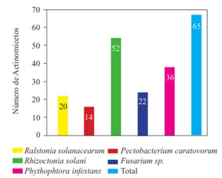 Respecto al tamaño de las zonas de inhibición, en el presente estudio los actinomicetos llegaron a inhibir hasta 27 mm de distancia frente a R. solani. Rothrock y Gottlieb (1981) reportaron zonas de inhibición de hasta 15 mm, lo que nos indica que nuestras cepas presentan mayor capacidad de antagonismo a este fitopatógeno. Por otro lado, P. infestans fue inhibida por 43.5 % de las cepas de actinomicetos evaluadas en este estudio; este valor es menor comparado a los resultados de Valois et al. (1996) quienes reportaron que Phytophthora sp. fue inhibida por 72 % de los actinomicetos aislados de suelos.
