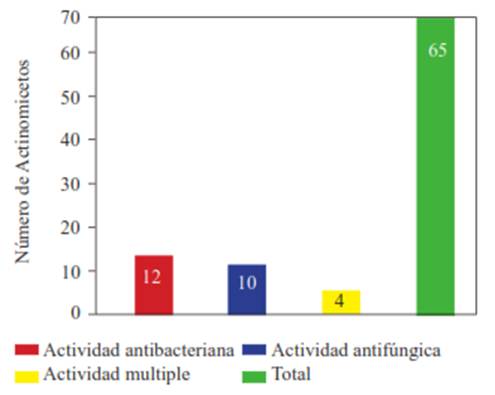 Los actinomicetos se caracterizan por producir metabolitos con actividad antimicrobiana, incluyendo biocontrol de fitopatógenos (Crawford et al., 1993; Park et al., 2002). Cepas de Streptomyces sp. han mostrado capacidad de suprimir el crecimiento de fitopatógenos in vitro, y por ello, muchos de sus metabolitos han sido propuestos para inhibir el crecimiento de estos patógenos in vivo (Franco-Correa, 2009). Enzimas extracelulares como quitinasas y β-1,3-glucanasas desempeñan una función significativa en la actividad antifúngica y biocontroladora, siendo responsables del micoparasitismo ejercido por ciertas cepas de Streptomyces y la supresión de enfermedades de las plantas (Goodfellow y Williams, 1983; Gonzáles et al., 2003).