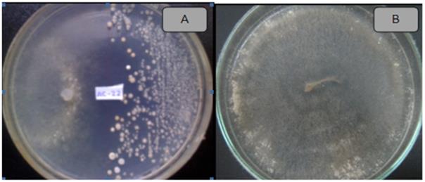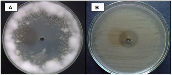 Figura 3 Actividad antifúngica del actinomiceto ACZI-22 frente a Rhizoctonia solani (A), control (B).