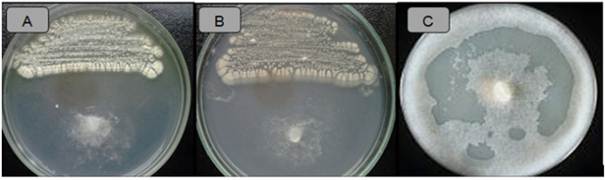 Figura 4 Actividad antagonista de actinomicetos frente a Fusarium sp. Cepa ACZIII-84 (A), cepa ACZIII-88 (B), control (C).