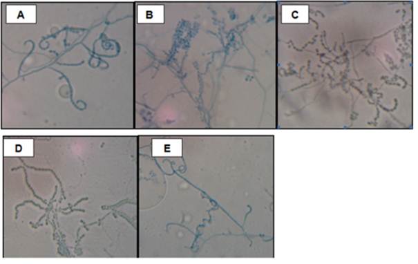 Figura 6 Observación microscópica de los actinomicetos seleccionados por su mayor actividad antimicrobiana frente a fitopatógenos de S. tuberosum. Cepas AACI-5 (A); ACZI-22 (B); ACZII-35 (C); ACZIII-84 (D) y ACZIII-88 (E). Aumento: 1000X.