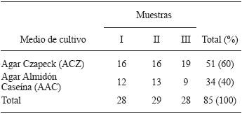 Aislamiento de actinomicetos del compost. Se aislaron un total de 85 cepas de actinomicetos provenientes de pilas de compost del predio "Casa Blanca". De los aislados, 51 actinomicetos se recuperaron del agar Czapeck Dox (ACZ) y 34 del agar almidón caseína (AAC). Los aislados para estudios posteriores se codificaron de acuerdo a su crecimiento en el medio de aislamiento primario y el número de muestreo.