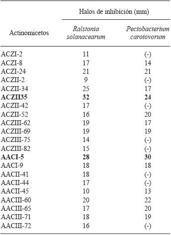 Selección de actinomicetos con actividad antagonista a bacterias fitopatógenas. Se realizó mediante el método modificado de "segunda capa" (Dopazo et al., 1988). Los actinomicetos fueron sembrados como macrocolonias en Agar Czapeck Dox pH 7.2 e incubadas a 28 ºC por 7 d. Las bacterias fitopatógenas fueron reactivadas en caldo nutritivo + 1% de glucosa (p/v), pH 7.0, y posteriormente inoculadas (10 µL) (0,5 escala Mac Farland) a 3 mL de agar semisólido licuado y temperado a 50°C y luego agregado rápidamente sobre los cultivos de los actinomicetos. Los cultivos fueron incubados a sus respectivas temperaturas de crecimiento (R. solanacearum a 30 ºC por 48 h y P. carotovorum a 26ºC por 48 h), realizándose luego las evaluaciones del tamaño (en mm) de los halos de inhibición (diámetro). Se consideró como positivo un diámetro ≥ a 5 mm.