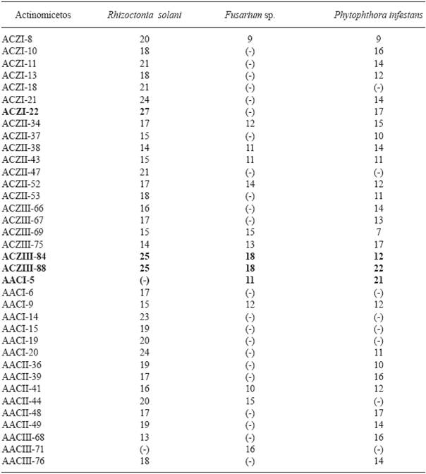 Selección de actinomicetos con actividad antagonista al cromista y hongos. Esta prueba se realizó mediante el método de co-cultivo señalado por Taechowisan et al., (2005). Rhizoctonia solani, y Fusarium sp, fueron reactivados y sembrados en agar papa dextrosa (APD) (Merck); mientras el oomiceto Phytophthora infestans en agar centeno, incubándose en todos los casos a 28 °C por 7 d. Los actinomicetos se sembraron en APD en un extremo de las placas. Los cultivos de patógenos se cortaron en trozos pequeños (0,5 cm de lado) y se colocaron al extremo opuesto del cultivo de cada actinomiceto. Se incubó por 4-5 d a 28 °C; luego se procedió a efectuar la evaluación de la medida de la distancia de crecimiento (mm) entre el actinomiceto y el fitopatógeno. Se consideró como positiva una distancia ≥ a 5 mm.