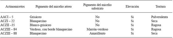 Cuadro 4 Características fenotípicas de actinomicetos seleccionados por su mayor actividad inhibitoria de fitopatógenos de Solanum tuberosum.