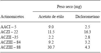Obtención del extracto crudo del compuesto antimicrobiano. Se realizó según Pandey et al. (2004) modificada para actinomicetos de suelos. Actinomicetos seleccionados, se inocularon en matraces Erlenmeyer de 500 mL, con 150 mL del medio extracto de levadura más glucosa (Sultan et al., 2002). Los cultivos fueron incubados a 28 °C por 10 d en agitación constante de 250 rpm, y posteriormente centrifugados a 4000 rpm por 25 min. La recuperación de metabolitos antimicrobianos a partir del sobrenadante se realizó mediante extracción con acetato de etilo y diclorometano (Merck) en una proporción 1:1 (v/v) y agitado vigorosamente por 1 h (Liu et al., 1986). El extracto crudo fue concentrado y separado con ayuda de un evaporador rotatorio (BUCHI R- 3000) a 40 °C; luego el residuo fue pesado y reconstituido con dimetilsulfoxido (DMSO) al 10 % para su conservación y análisis posterior.