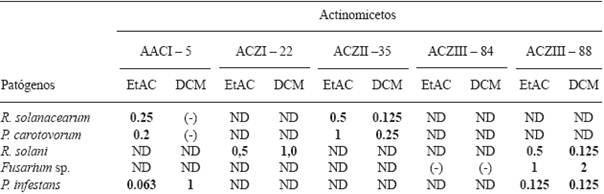 Concentración Mínima Inhibitoria (CMI) del extracto crudo. Se realizó según Caviedes et al. (2002) en microplacas de 96 pocillos (Pure Grade - Merck). Las pruebas se realizaron distribuyendo las diluciones de los extractos crudos de los actinomicetos seleccionados en el caldo nutritivo + 1% de glucosa a doble concentración para las bacterias y caldo extracto de levadura + glucosa a doble concentración para los hongos y el oomiceto P. infestans. La cepa fitopatógena agregada a cada pocillo fue de 20 µL. Se incubó por 48 h para las bacterias y 5 d para los hongos y el cromista. Al cabo de este tiempo, se agregó 50 µL de tetrazolium (Sigma) a todos los pocillos y se incubaron durante 24 h. Un cambio de color del amarillo al púrpura fue interpretado como crecimiento de bacterias.