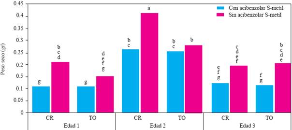 In experiment 2, the variance analysis only showed significant effect of the age X genotype X resistance inducer interaction (P = 0.0069) on the dry weight of the aerial part (DWAP). This result indicates that the application of ASM caused a significant decrease in the DWAP of plants of all genotypes and ages, with the exception of the Camino Real cv., age 1 (Figure 7). The DWAP of the Camino Real cv., age 2, without ASM had the highest value, but it was statistically equal to the plants of the same cultivar, age 1, with and without ASM and to the Tetela de Ocampo cultivar, age 2, without ASM. The DWAP of plants age 3, with ASM was significantly lower in the plants treated with this resistance inducer, regardless of the cultivar.