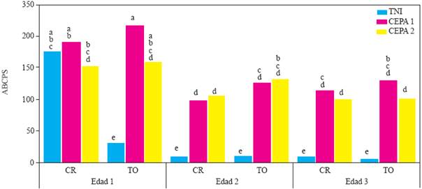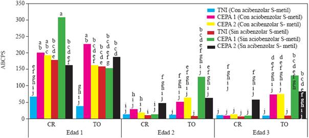 Figure 1 Experiment 1. Effect of the Plant age X Genotype X Resistance inducer X Phytophthora capsici inoculation interaction on the area under the disease progress curve of Serrano pepper plants (Capsicum annuum L.) cultivated in unsterilized soil from the Vega de Metztitlán, Hidalgo (VMH). The oomycete strains were isolated from Serrano pepper plants from the VMH. The inoculation was done with 105 zoospores per plant 45 days after transplanting. Means from ten replicates. Means with the same letter are statistically equal (Tukey α = 0.5). Age 1, 2, and 3 = transplant at 45, 30, and 15 days after seeding. CR = Camino Real (Harris Moran) cv. TO = Tetela de Ocampo, Puebla, creole cv. TNI = control without P. capsici inoculation, unsterilized soil.