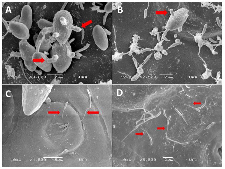 Sin embargo, el beneficio de usarlos consiste en un control biológico seguro e inocuo, entre otros. En contraste, los extractos de corteza inhibieron menos que los extracto de fruto. Bajo las mismas condiciones descritas (13 días, 20 mg mL-1) C. gloeosporioides fue inhibido en 48.0 ± 1.6%, por extractos de corteza, lo cual es casí 50% inferior al 91.5% que se obtuvo con fruto. Asimismo, B. cinerea fue más susceptible que C. gloeosporioides (más resistente) a los extractos; Por ejemplo, en 13 días de tratamiento y 10 mg mL-1, los extractos de fruto inhibieron el crecimiento de B. cinerea y C. gloeosporioides en 85.5 ± 2.1% y 45.8 ± 10.0%, respectivamente, lo cual es indicativo de esta tendencia. Los resultados de este estudio indican que los extractos reprimieron el crecimiento del micelio fúngico, con los mejores efectos al aplicarlo a concentraciones de ³10 mg mL-1, obteniendo inhibición máxima con 20 mg mL-1 (Cuadro 1). La inhibición fue débil y con comportamiento errático cuando se aplicó a 1 mg mL-1. No hay trabajos previos sobre el efecto de extractos crudos de G. ulmifolia contra estos patógenos; sin embargo, si hay informes sobre los efectos de otros extractos de plantas contra ellos. El extracto de metanol de Piscidia piscipula aplicado a 2 mg mL-1 y 5 días ocasionó 52.3% ICM sobre C. gloeosporioides (Peraza-Sanchez et al., 2005), resultado mejor que el nuestro. También, los extractos crudos hidroalcohólicos de la hoja del jaboncillo (Sapindus saponaria), en 7 días de tratamiento inhibieron 70% el crecimiento micelial de C. gloeosporioides al aplicarlo a 50 mg mL-1 y 80% al aplicarlo a 100 mg mL-1, mientras que concentraciones menores de 50 mg mL-1 no tuvieron efecto (Passos Marinho et al., 2018). Extractos alcohólicos de las hojas de las vides silvestres (Vitis) aplicados a 12% de concentración ocasionaron 70% ICM de B. cinerea (Apolonio-Rodríguez et al., 2017), menor que nuestros resultados. La actividad antimicrobiana y medicinal de los extractos de corteza, partes aéreas y frutos de G. ulmifolia se atribuye a la presencia de flavonoides del subgrupo flavan-3-ols (Lopes et al., 2009); compuestos tales como la catequina, epicatequina, flavanocoumarinas y las procianidinas y proantocianidinas derivadas de ellas, con propiedades antioxidantes y antiinflamatorias (Maldini et al., 2013). Los valores de concentración letal (CL, mg mL-1) se calcularon considerando los mejores datos de inhibición en el cuadro 1, y son los siguientes: 1. C. gloeosporioides: Fruto (CL50 = 10.57, CL95 = 20.94); Corteza (CL50 = 16.54, CL95 = 34.13), 2. B. cinerea: Fruto (CL50 = 5.24, CL95 = 11.09); Corteza (CL50 = 10.6, CL95 = 22.6). En la figura 2 se aprecian las características morfológicas de los hongos estudiados. La anatomía de C. gloeosporioides y B. cinerea ha sido previamente reportada. En la Figura 2A se muestra C. gloeosporioides. Sus características principales (Rodríguez-López et al., 2009) son hifas septadas cuyo color es de gris claro a gris oscuro. Los conidios son hialinos, cilíndricos y separados del pedicelo por un tabique transversal. Para B. cinerea (Figura 2B), se establece (Miclea Raluca Vasilica et al., 2012) hifas septadas y cilíndricas, hialina al principio y más tarde se vuelven marrón o negro. Se multiplican por división citoplásmica. Los conidios son globulares o elípticos, formando cadenas exógenas (blastosporas). El tratamiento de los hongos con extractos de guacimo ocasionó alteraciones en su morfología, a nivel de micelios deformados, ondulados, plegados, con porciones planas o vacías (Xu et al., 2007), con coagulación citoplásmica, que se muestran como pequeñas vesículas en el micelio (Figura 2C). Los compuestos fenólicos no polares, como los que se encuentran en el guacimo, podrían actuar sobre la membrana citoplasmática, causando su desintegración y pérdida de trifosfato de adenosina, lo que resulta en la muerte celular (Hassani et al., 2012). Los conidios mostraron cambios en su forma original (Figura 2E). La pared celular de estos elementos puede sufrir daños, con numerosas protuberancias que eventualmente llevan a su colapso, lo que podría inhibir su germinación (Sharma y Tripathi, 2008). De igual manera, C. gloeosporioides tratado con benomil (bencimidazol) mostró hifas vacías con grandes estructuras anómalas (Figura 2F). Benomilo es un fungicida comercial que se ha utilizado durante muchos años para controlar la antracnosis antes de la cosecha de frutos.