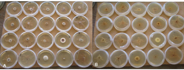 Figura 1 Morfotipos de Armillaria obtenidos de huertas de aguacate de diferentes municipios de la franja aguacatera de Michoacán. A. Anverso, B. Reverso.