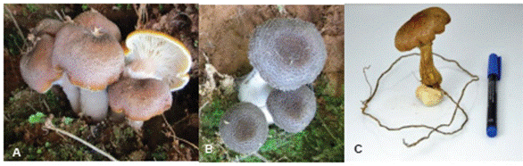 Figura 2 Basidiocarpos de Armillaria gallica colectados en Charapan, Michoacán. A. Basidiocarpos maduros de Armillaria gallica (píleo amarillo con escamas); B. Basidiocarpos de A. gallica inmaduros con coloración grisácea y escamas; C. Basidiocarpo solitario con rizomorfo en la base.