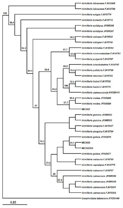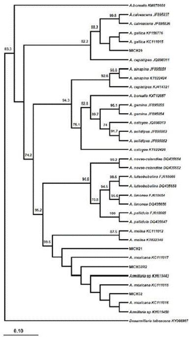 Figura 3 Análisis filogenético con secuencias de especies de Armillaria provenientes de aguacate y del GenBank amplificadas con el gen tef α-1. El aislado MICH29 se agrupó directamente con la especie Armillaria gallica. Las cepas MICH32 y MICH32R están estrechamente relacionadas con Armillaria mexicana, mientras que MICH21 se agrupó entre el clado de A. mellea y A. mexicana.