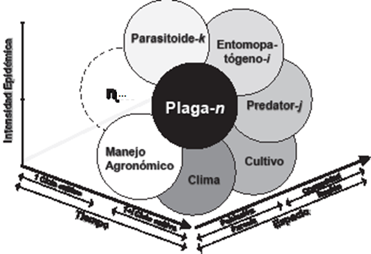 Figura 1 Sistema Epidemiológico definido por la interacción de factores determinantes de un proceso epidé- mico: especie plaga, entomopatógeno, depredador (predator) y parasitoide, cultivo, manejo agro- nómico, clima, y algún otro factor específico (ni) y los cuales operan a distintos niveles espacio-temporal (Tomado de Mora-Aguilera et al., 2017).