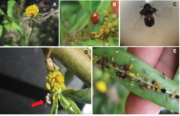 Estudios desarrollados en cítricos registraron una reducción importante de pla- gas del cultivo del limón persa Citrus x latifolia en donde se incorporó la planta A. curassavica; entre ellas, D. citri. Una explicación dada fue la abundancia de EN reclutados por A. curassavica, principalmente de las familias Coccinellidae, Syr- phidae, Chamaemyiidae y Chrysopidae (Godoy-Ceja y Cortez-Madrigal, 2018).