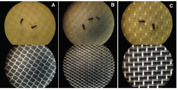 Figura 3 Diferentes tipos de malla evaluadas en la emergencia selectiva de Tamarixia triozae, parasitoide de Bactericera cockerelli como modelo para implementar con D. citri y su parasitoide. A) Mallas de 700 x 700 µm, B) 700 x 900 µm, C) 500 µm.