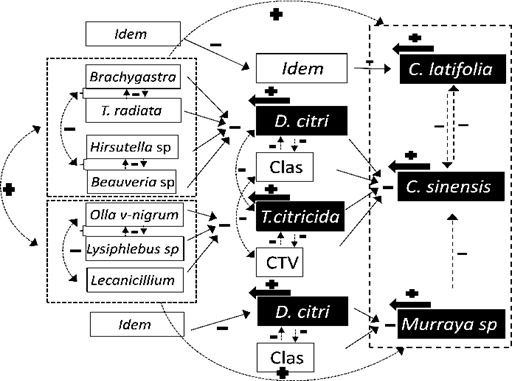 D. citri, y por tanto a CLas al suprimir la competencia por brotes vegetativos entre ambas plagas. Finalmente, todo el complejo D-P-E de D. citri y T. citricida favore- ce (+) la salud de los cítricos en general (Figura 4) (Mora et al., 2017).