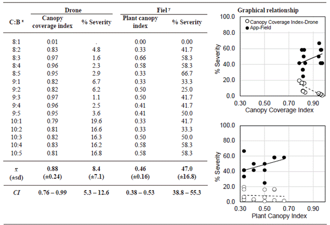 RGB image analysis (13mpx) taken with DJI® Phantom 3 Drone. The analysis at 27 m within the 15 selected quadrants of the study plot (Figure 6A1) allowed estimating an average powdery mildew severity of 8.4 % (CI = 5.3 - 12.6 %) and a canopy coverage index (VCI) of 0.88 (CI = 0.76 - 0.99), contrasting with the field assessment which obtained a severity of 47 % (CI = 38.8 - 55.3 %) and VCI = 0.46 (CI = 0.76 - 0.99) (Figure 6A2 and Table 3). The image analysis revealed an inverse relationship between severity and VCI (R2 = 0.68), suggesting that higher foliage density corresponds to lower damage intensity (Table 3). However, in comparison to severity and plant canopy index (PVI) assessed with App-Monitor v1.0, showed a directly proportional trend, although not significant (R2 = 0.2) due to severity varying within the experimental plot (Figure 6). The classification algorithm underestimated by 46.4 % to 63.7 % in quadrants with VCI > 0.94, associated with the occurrence of Erysiphe vignae primarily in the lower to middle canopy strata, less exposed for aerial imaging (Table 3, Figure 6A1-10A2).