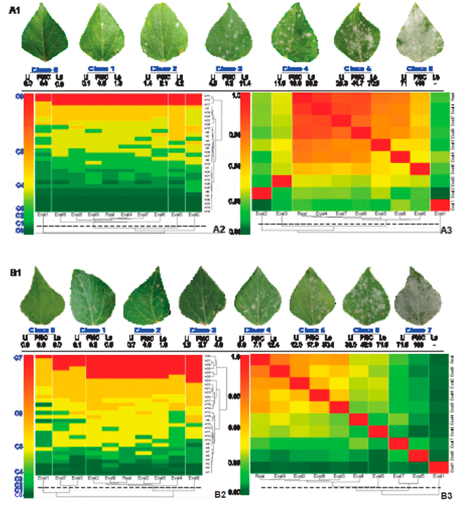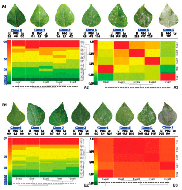 Figure 2 A1 and B1. Logarithmic-diagrammatic scales of 7 and 8 classes for assessment of powdery mildew severity on Ayocote bean (P. coccineus) leaves, during the Controlled Environment Validation (CEV) process of 30 leaves by nine raters. A2 and B2. Heatmap of Pearson correlation coefficient (r) among nine raters by severity scale. Values of r = 0.8 - 1 indicate the reproducibility of each scale among raters. A3 and B3. Heatmap of severity class in 30 leaves evaluated by scale and rater. The color represents the class value assigned by the rater for each leaf. For rater and leaves, a Hierarchical cluster analysis is plotted, grouped by the complete method and Euclidean distance.