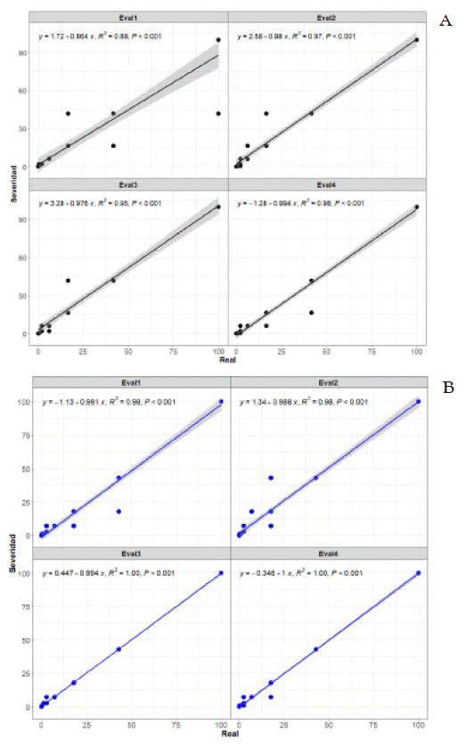 Figure 5 Correlation plots between severity (y) assessed by scale and actual values (x) from four raters during Field Validation (VCa) with 30 Phaseolus coccineus leaves. The linear regression equation (y = βo + βx + e) is fitted to determine parameters β, R2, and p-value using the stat_poly_eq function. A. LDS-7classes. B. LDS-8classes.