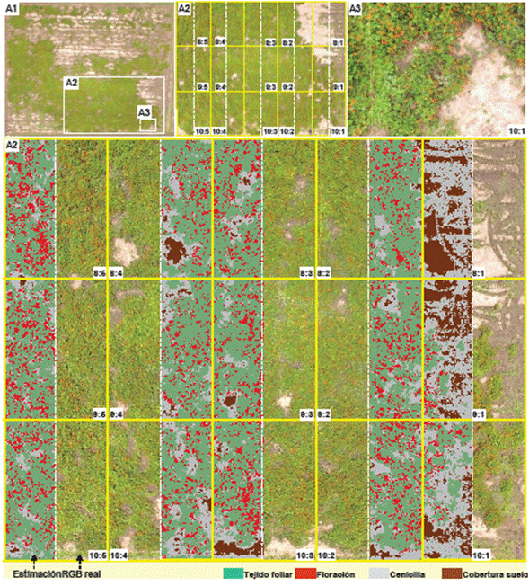 Figure 6 Estimation of canopy and severity indicators using RGB imagery (13 mpx) from Phantom 3 processed through supervised segmentation algorithm in ArcMap® v10.3. A1. Image of the total experimental area (40 x 52 m). Captured at 50 m altitude. A2. Block of 15 selected quadrants based on uniformity in host continuity, canopy, and maximum inductivity. Continuous yellow lines depict quadrant divisions. Dashed white lines represent selected blocks for algorithm versus real image estimation. Captured at 27 m. A3. Image at 5 m of a selected sector for designing ‘RGB signature’ with crop categories (foliar tissue, flowering, powdery mildew, and soil coverage).
