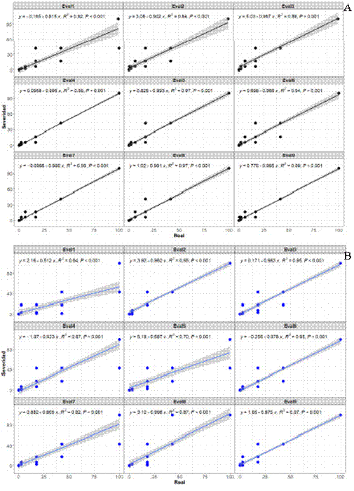 Figure 3 Correlation graphs between severity (y) assessed using the scale and real values (x) by nine raters during the Controlled Environment Validation (CEV) with 30 Phaseolus coccineus leaves. The linear regression equation (y = βo + βx + e) is fitted to determine β, R2, and p-value parameters using the stat_poly_eq function. A. LDS-7 classes. B. LDS-8 classes.