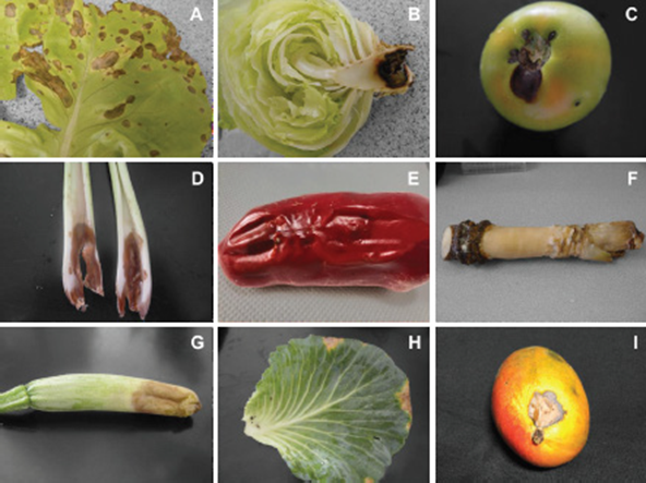 | Lactuca sativa var. capitata | Lechuga Iceberg | 6 | Tallo y Hoja | Pudrición blanda (Figura 1B), Mancha | Cartago | 11 |