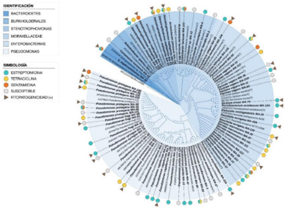El análisis de los 116 aislamientos de una colección proveniente de síntomas de pudrición blanda, necrósis y manchas de hojas, tallos, frutos de 19 cultivos, mostraron la presencia de 20 géneros de los cuales Pseudomonas (48 %), Serratia (12 %), Pantoea (9 %) y Stenotrophomonas (6 %), fueron los más abundantes, con Pseudomonas como el género con mayor número de especies y aislamientos observados. Entre las bacterias fitopatógenas presentes en la colección se identificaron Pseudomonas syringae, P. cichorii, P. corrugata, Pantoea stewartii subsp. indologenens, P. anthophila, Dickeya oryzae, Enterobacter cloacae subsp. dissolvens y Pectobacterium aroidearum, que estuvieron entre el 23 % de aislamientos positivos para la RH. Según las condiciones del estudio se detectó resistencia al menos uno de los tres antibióticos en el 60 % de los aislamientos evaluados siendo la resistencia a estreptomicina la más frecuente. La resistencia se observó en bacterias aisladas de 17 de las especies vegetales, donde el jitomate, palmito, lechuga, apio, zapallo y repollo mostraron la mayor proporción de aislamientos resistentes, lo que sugiere un mayor riesgo en la producción de estos alimentos a seleccionar bacterias resistentes a antibióticos. La información obtenida indica la necesidad de una mayor regulación en la venta y uso de productos antimicrobianos para mitigar los efectos de estas sustancias en el medio ambiente, los animales y las personas.