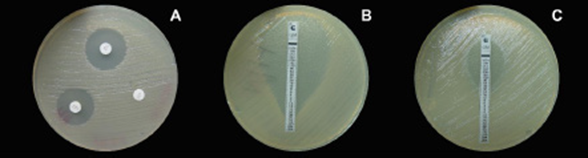 Figura 3 A. Halos que demuestran la sensibilidad a los antibióticos en discos (Oxoid) de gentamicina y tetraciclina y resistencia a estreptomicina (ausencia de halo) en la prueba de difusión en disco Kirby Bauer. B. Bacteria con una CMI de 0.25 µg mL-1 para gentamicina, determinada por el método epsilométrico (E-test). C. Bacteria con una CMI de 32 µg mL-1 para el mismo antibiótico.