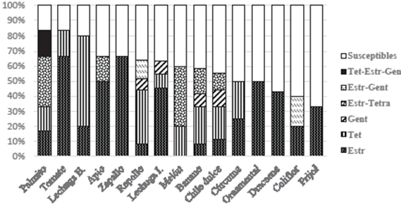Se encontró resistencia a estreptomicina en bacterias aisladas de todos los cultivos excepto higo. Para este antibiótico, todos los aislamientos provenientes de jitomate y cúrcuma tuvieron una CMI máxima de >1024 µg mL-1, los de apio una CMI de 128 a >1024 µg mL-1 y en el caso de repollo, banano, melón y coliflor, de 12 a >1024 µg mL-1, chile dulce de 16 a >1024 µg mL-1 y lechuga Iceberg de 12 a 96 µg mL-1. Los demás cultivos presentaron bacterias con CMI entre 12 y 48 µg mL-1. La resistencia a tetraciclina se detectó en bacterias provenientes de 10 de los 19 cultivos y aislamientos de repollo, banano, chile dulce, lechuga Boston y zanahoria tuvieron la CMI máxima de >256 µg mL-1. A pesar de encontrarse con menor frecuencia, los aislamientos resistentes a gentamicina tuvieron CMI de 256 en el palmito, 16 a 256 en el repollo y de 12 a 48 µg mL-1 en banano, chile dulce y coliflor (Cuadro 2). Dentro de los géneros que tuvieron una mayor cantidad de aislamientos resistentes, se encuentran Pseudomonas, Serratia, Pantoea y Stenotrophomonas, todos con miembros fitopatógenos y saprófitos caracterizados por su identificación molecular y la reacción de hipersensibilidad (Figura 2 y 5).