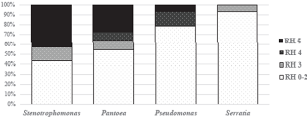 Al comparar la calificación del grado de patogenicidad con el número de cepas resistentes identificadas en cada categoría de RH (Figura 6), se encontró que el 45 % de esta población con RH negativa, presentó resistencia a alguno de los antibióticos estudiados, aunque la proporción fue menor a la encontrada en los aislamientos patógenos (RH +), en los que las bacterias resistentes representaron un 70 a un 83 %, correspondientes al nivel 3 y 5, respectivamente. Resistencia a los tres antibióticos fueron detectadas en todos los niveles de fitopatogenicidad, y una bacteria con RH 5 (Stenotrophomonas malthopilia MA-54), fue la única a la que se le detectó resistencia a los 3. En el nivel de mayor patogenicidad se detectó mayor proporción de bacterias con resistencia múltiple.