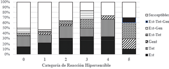 Figura 6 Proporción de cepas resistentes a los antibióticos estudiados de acuerdo con la escala de RH (niveles 0 a 5) determinada por Herrera (2009). En el eje Y se indica el porcentaje de aislamientos susceptibles dentro de cada categoría.