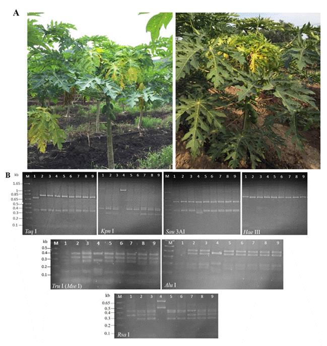 Figure 1 Detection of phytoplasmas in agroecosystems papaya with Bunchy Top disease in Colima, Mexico. A) Papaya plants showing stems with shortened internodes and yellow, chlorotic leaves, positive to phytoplasmas. B) In vitro RFLPs profiles of gene 16Sr (primers R16F2n/R16R2) of the phytoplasmas under study. Lanes 1-4: samples 1S-4Spapaya, Lanes 5-6: samples 5S-6S-Amaranthus palmeri; Lane 7: sample 7S-Echinochloa colona; Lane 8: sample 8S-Micrutalis calva; and Lane 9: sample 9S-Balclutha mexicana. The DNA was digested with 10 U of every enzyme and the products were separated by electrophoresis in 3% (w/v) agarose gels in 1×TAE buffer. Lane M: 1 kb plus molecular weight marker (Thermo Scientific, EUA).