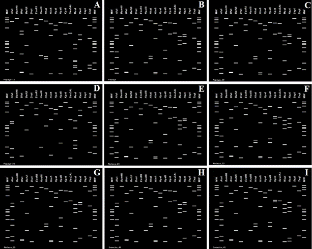 Figure 2 In silico RFLPs profiles of gene 16Sr of the phytoplasmas under study, generated with iPhyClassifier with 17 restriction enzymes. A) sample 1S-papaya; B) sample 2S-papaya; C) sample 3S-papaya; D) sample 4S-papaya, E) sample 5S-Amaranthus palmeri; F) sample 6S-Amaranthus palmeri; G) sample 7S-Echinochloa colona; H) sample 8S-Micrutalis calva; I) sample 9S-Balclutha mexicana. Lanes MW: φX174 DNA digested with Hae III.
