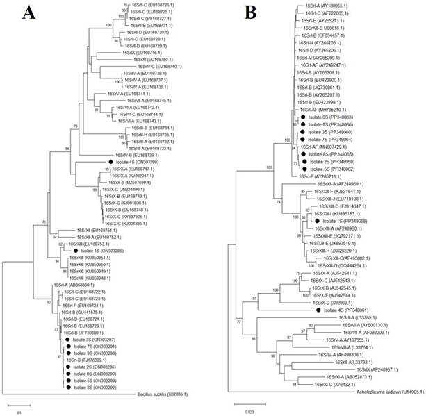 Phytoplasma detection and identification was conducted by PCR, sequencing and phylogenetics of translocase subunit SecA (secA) and 16S ribosomal RNA (16Sr) genes, and PCR-RFLPs in vitro and in silico for 16Sr gene.