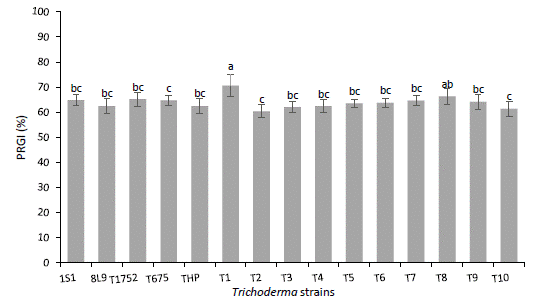 El análisis estadístico indicó que existieron diferencias significativas (p < 0.05) en la inhibición del crecimiento entre las cepas evaluadas. De acuerdo con la comparación de medias se encontraron tres grupos de inhibición, la cepa T1 fue la que presentó el mayor PICR (70 %), mientras que las cepas T675, T2 y T10 fueron las que exhibieron menor inhibición (Figura 4). En general el PICR se mantuvo entre el 60 al 70 %, por lo que las cepas pueden considerarse con potencial para el control del patógeno. Al respecto Yao et al. (2023) tras un análisis de diferentes estudios indica que una cepa de Trichoderma puede considerarse con potencial en el control efectivo de la enfermedad cuando la inhibición de crecimiento supera el 50 %.