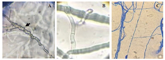 Figura 6 Mecanismos de parasitismo de Trichoderma sp frente a Neopestaloptiopsis sp. A) Enrollamiento, B) Formación de ganchos y C) Adhesión y lisis.