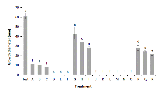 Figura 7 Crecimiento de Neopestalotiopsis sp en medio PDA con fungicidas comerciales. Test: testigo sin producto; A-C: Captán 200, 300 y 400 g 100 L-1; D-F: Tebuconazol 100, 250 y 375 mL 100 L-1; G-I: Carbendazim 400, 500 y 600 mL 100 L-1; J-L: Extracto de Canela y Neem 500, 1000 y 1500 mL 100 L-1; M-O: Ácido Peracético 25, 50 y 75 mL 100 L-1; P-R: Fungicida orgánico a base de cítricos 500, 750 y 1000 mL 100 L-1. 400 g y 600 mL 100 L-1 (p≤0.05).