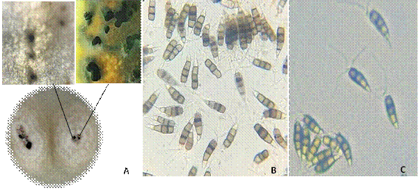 Después de ocho días de crecimiento, las colonias en medio PDA presentaron textura algodonosa, micelio color blanco que fue tornándose a salmón y márgenes concéntricos. Cuando el cultivo tuvo seis días se formaron masas negras de esporas (Figura 2). A los 12 días se produjeron acérvulos globosos de color negro en el medio de crecimiento y sobre el tejido los estromas presentaron forma irregular (Figura 2). Los conidios presentaron tres células centrales de color oscuro y dos basales hialinas, con tres apéndices apicales (Figura 2). La morfología del patógeno coincidió con las características de género descritas por Maharachchikumbura et al. (2014); sin embargo, de acuerdo con algunas características señaladas por Maharachchikumbura et al. (2012), el aislado de Neopestaloptiopsis de este estudio podría tratarse de N. rosae, especie que fue confirmada presente en cultivo de fresa en México (Rebollar-Alviter et al., 2020).
