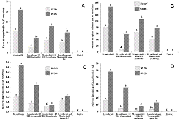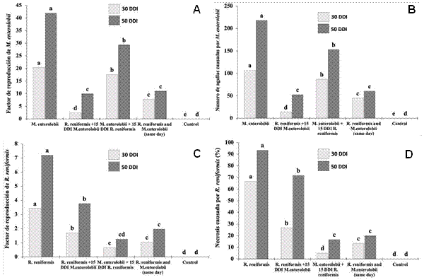 Figura 2 Reproducción y severidad de R. reniformis y M. enterolobii en plantas de tomate a los 30 y 50 días después de la inoculación (ddi). A) Factor de reproducción de M. enterolobii. B) Número de agallas causadas por M. enterolobii. C) Factor de reproducción de R. reniformis. D) Porcentaje de necrosis radicular causada por R. reniformis. La comparación de medias se realizó entre barras del mismo color; medias que no comparten letra son significativamente diferentes.