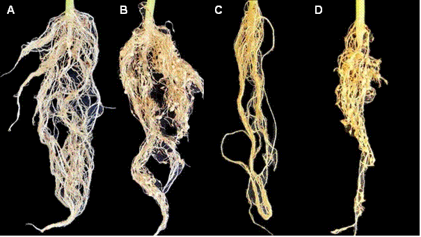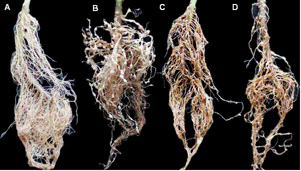 Figura 4 Raíces de tomate a los 50 días después de la inoculación (ddi). A) Testigo sin inoculación. B) Raíz con agallas causadas por M. enterolobii. C) Raíz con raquitismo y necrosis causados por R. reniformis. D) Raíz con agallas, necrosis y síntomas de raquitismo, inoculada simultáneamente con R. reniformis y M. enterolobii.