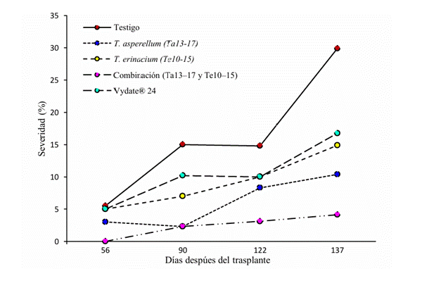 Efecto del control microbiano en los parámetros epidemiológicos. El ABCPE en los tratamientos, mostró en la combinación T. asperellum (Ta13-17) y T. erinaceum (Te10-15) menor progreso de la enfermedad con 138.19 unidad % día-1; seguido del tratamiento individual de T. asperellum con 376.94 unidad % día-1. Lo que significó que durante el ciclo del cultivo en estos dos tratamientos se mejoró el control de la enfermedad con respecto al testigo. En un manejo integrado de nematodos agalladores (Naccobus aberrans y M. incognita), con biosolarización y T. viride se mantuvo 457 unidad % día-1 (Magallanes, 2021), lo que evidenció también que una acumulación de materia orgánica en asociación con organismos antagónicos y saprofitos puede disminuir la población de M. incognita (Pérez et al., 2019). La enfermedad se pudo caracterizar y ajustar al modelo de descripción Weibull con el cual se estimó la tasa de infección aparente mediante el inverso de su parámetro b-1 (Pennypeker et al., 1980). Al respecto, los tratamientos que permitieron menores tasas de infección aparente (velocidad de la enfermedad) fueron: el tratamiento de la combinación T. asperellum (Ta13-17) / T. erinaceum (Te10-15), tratamiento con Vydate®, y T. erinaceum, lo que demostró que los intervalos de aplicación fueron los adecuados para el control de la enfermedad. En contraste, el tratamiento que mayor intensidad de enfermedad mostró fue el testigo, sin control del nematodo (Cuadro 1). Al final del experimento el parámetro de Yfinal, mostró que la combinación Ta13-17 y Te10-15 fue la que mejor controló la enfermedad al permitir un 4.13 % de severidad final, lo cual superó (p≤0.01) al resto de los tratamientos ya que estos permitieron al menos un 30 % de severidad de la enfermedad (Cuadro 1). El efecto antagónico de Trichoderma spp. en el control del nematodo, está asociado con sus mecanismos de acción en la producción de metabolitos secundarios como viridina, gliotoxina, gliovirina, que inhiben no solo el crecimiento de hongos, si no la eclosión de huevos e inmovilización de estadios juveniles de nematodos (Zin y Badaluddin et al., 2020) (Cuadro 1).
