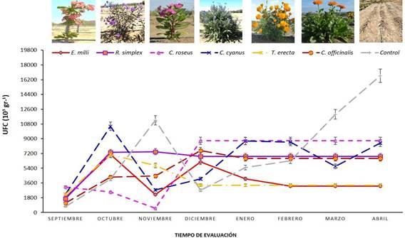 Población. Las poblaciones fúngicas en las especies ornamentales presentaron variaciones a través del tiempo, donde en la mayoría de los casos la población disminuyó en el mes de octubre, lo cual se relacionó con los cambios en la temperatura y la permanencia de humedad en el suelo. C. cyanus aumentó la población fúngica al pasar de 2,833.33 a 8,096.66 UFC g -1 de suelo (Figura 1). Mientras que en E. mili el aumento de la población fue menor (de 3,159 a 3,559 UFC g -1 de suelo). Por su parte la especie C. roseus presentó una población de 3,126.66 UFC g -1 de suelo y al final su población incrementó a 5,086.66 UFC g -1. Por otro lado, C. officinalis inició con 1,060 UFC g -1 de suelo y aumentó considerablemente a 6,633.33 UFC g -1 de suelo al finalizar el experimento. De la misma manera R. simplex mantuvo una población inicial de 1,686.66 UFC g -1 de suelo y finalizó con 5,720 UFC g -1. En T. erecta su población fue de 2, 323.33 a 3,333.33 UFC g -1 de suelo al inicio y final respectivamente. Por último, en el tratamiento control se presentó una variación significativa en la población fúngica, al iniciar con 720 UFC g -1 de suelo y finalizó con 12,483.33 UFC g -1 de suelo, superando la población en las plantas ornamentales (Figura 1). En general, la mayoría de las plantas ornamentales presentaron un aumento en la población fúngica del suelo al final del experimento, pero ninguna superó al control, donde el microbioma incremento significativamente.