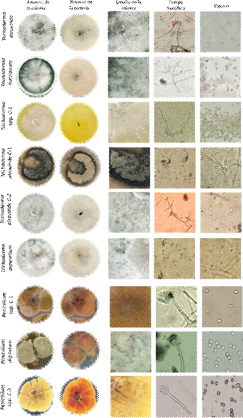 | Trichoderma spp. | Amarilla | Amarillo | Granular | Rapido | Globosas |