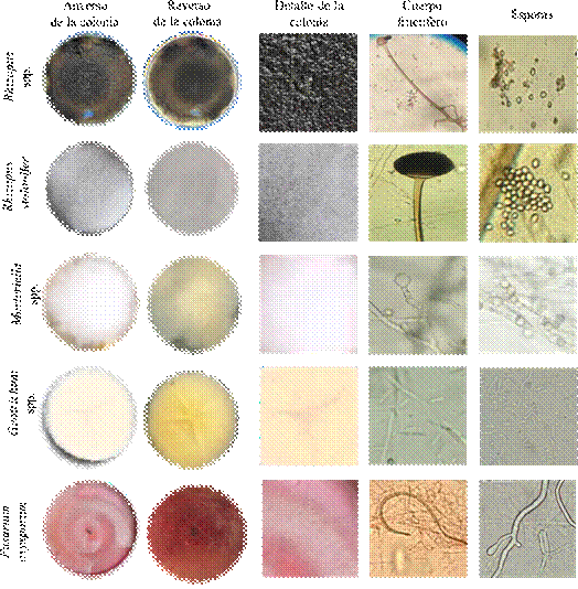 | Rhizopus spp. | Cafe | Cafe | Algodonosa | Rapido | Globosas |