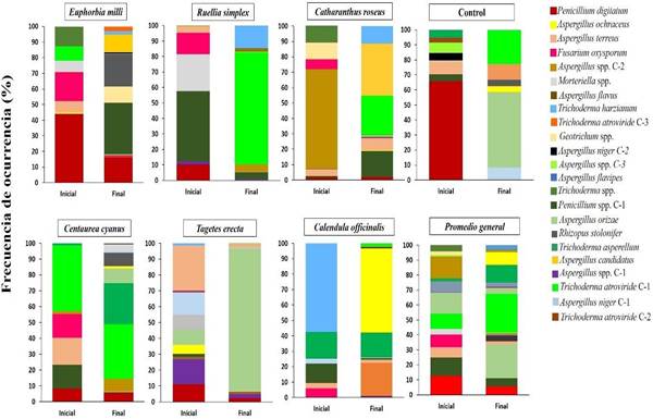 En el caso de C. cyanus, registró la mayor diversidad de especies fúngicas al final del experimento, al presentar siete aislados al inicio y 13 aislados al final del estudio, donde destacaron los géneros Aspergillus, Penicillium, Rhizopus y Trichoderma. Le siguió en orden de importancia, E. mili al registrar al inicio siete aislados y posteriormente 12. Así mismo, C. officinalis registró siete aislados y al final aumentó a nueve aislados. En R. simplex y C. roseum el número de aislados se mantuvo en siete y nueve aislados respectivamente. Mientras que en Tagetes (12-8 aislados) y el tratamiento control (9-6 aislados), la diversidad disminuyó (Figura 5). La diversidad presente en este tipo de especies reporta que, a pesar de las características en zonas áridas, como altas temperaturas, baja cantidad de materia orgánica, así como baja humedad, no impactaron en los géneros Aspergillus, Trichoderma y Penicillium. Esta diversidad es relevante para las plantas establecidas, como lo señala Reinhart y Callaway (2006) al mencionar que las interacciones entre las plantas y los microorganismos del suelo son de naturaleza dinámica y se basan en presiones coevolutivas. Además, Batten et al. (2006) señalan que las comunidades microbianas rizosféricas difieren entre las especies de plantas, entre los genotipos dentro de las especies y entre las diferentes etapas de desarrollo de las plantas, aunque no está claro si esto se debe a una mayor heterogeneidad del hábitat, el aumento de la biomasa vegetal comúnmente observado con comunidades de plantas muy diversas o una mayor diversidad de sustratos de carbono y compuestos de señalización proporcionada por las plantas. Fitzpatrick et al. (2018), señalan que el microbioma fúngico, se divide en tres categorías (mutualistas, patógenos y saprófitos) en función del tipo de planta, la cual a la vez depende de las interacciones antagónicas y sinérgicas dentro del microbioma del suelo y está confirmado que las plantas que crecen en un suelo con un microbioma común pueden alterar la abundancia relativa de mutualistas, patógenos y saprófitos en ese suelo.