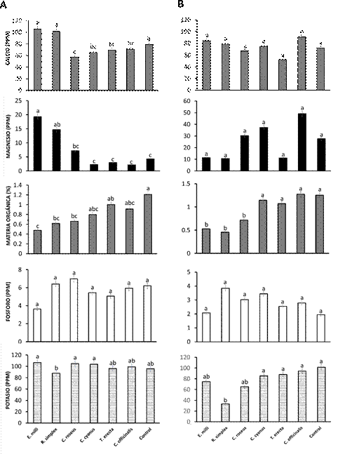 Figura 6 Efecto de plantas ornamentales en los nutrientes del suelo. A) Análisis inicial y B) final. Los valores son medias ± desviación estándar. a b c d; las medias seguidas por la misma letra para un factor dado no son significativamente diferentes (p < 0.05; prueba HSD de Tukey).
