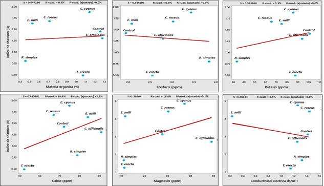 Figura 7 Correlación entre el índice de diversidad fúngica de Shannon y las características del suelo asociadas a plantas ornamentales.